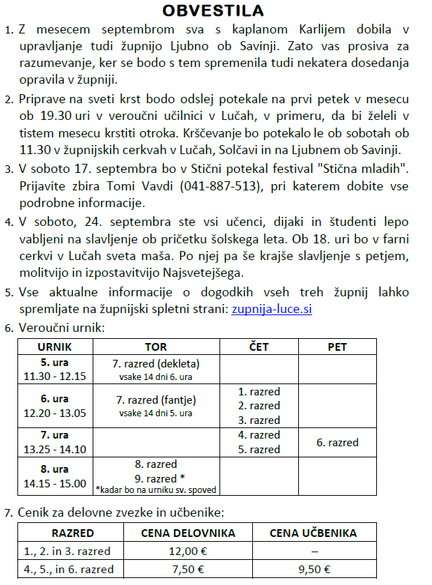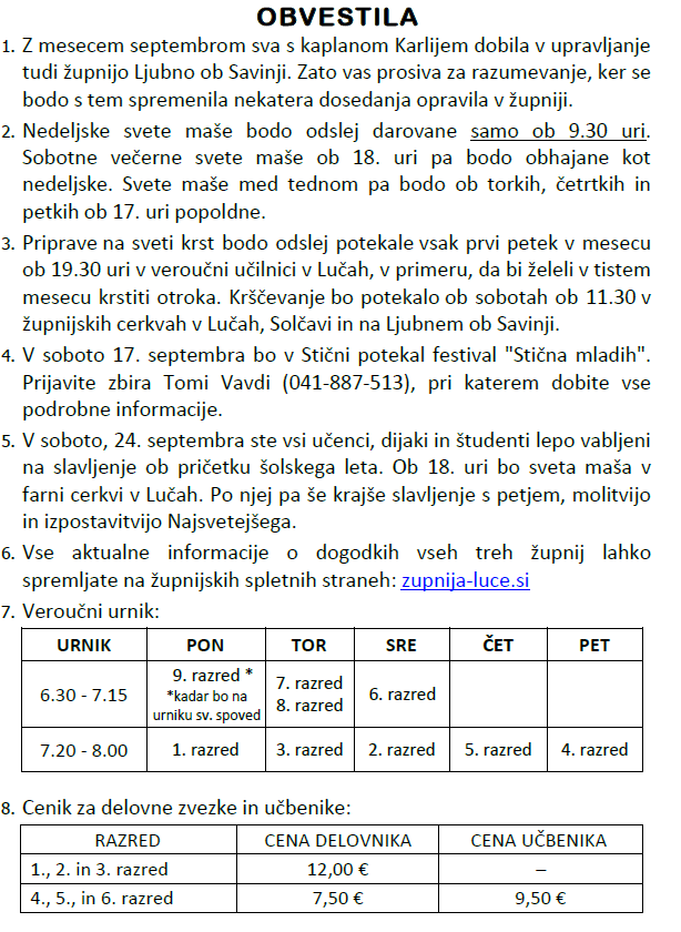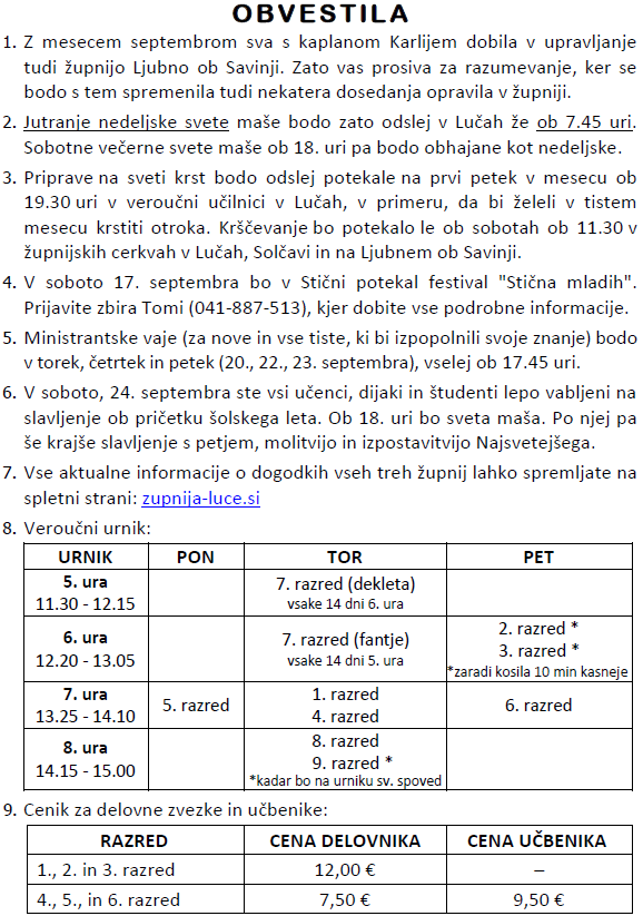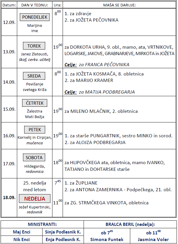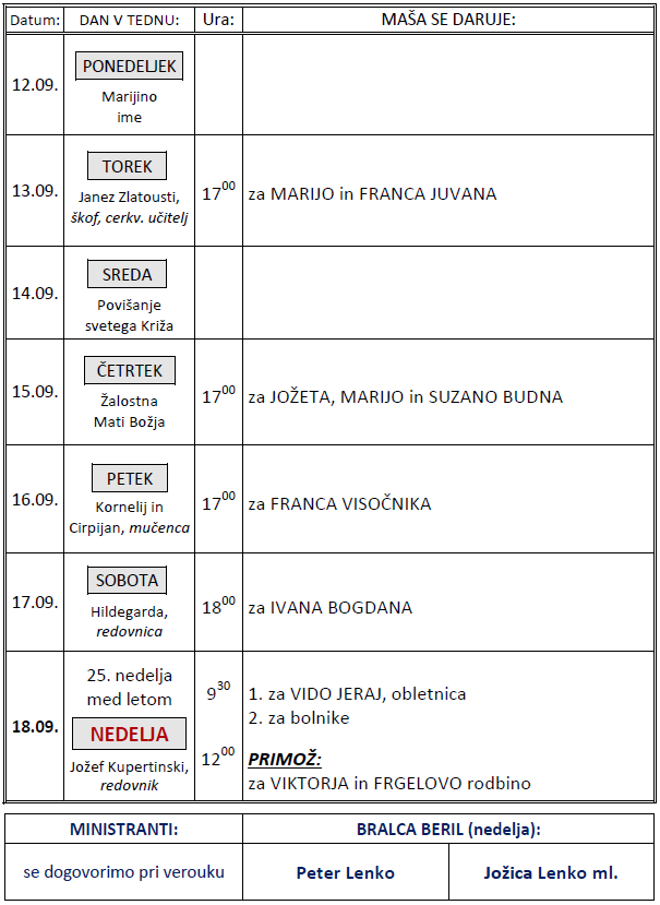 Svete maše v tednu od 12. do 18.9.