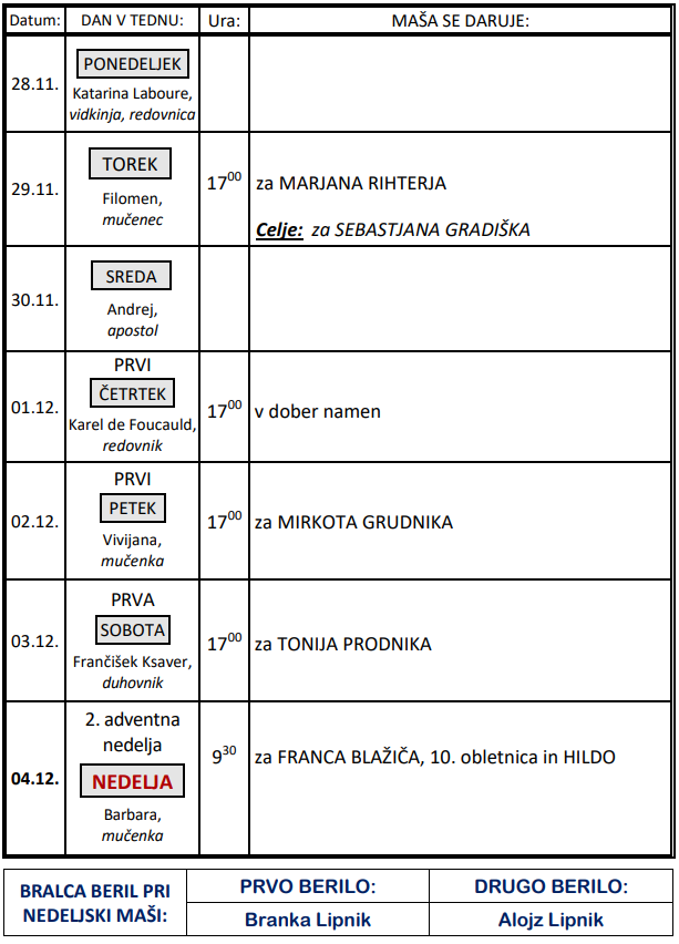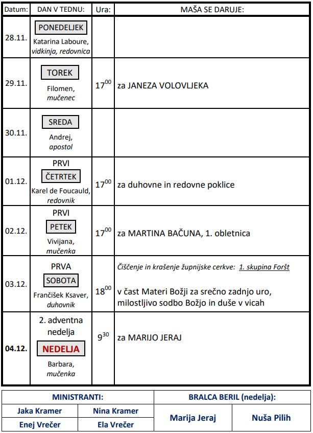 Svete maše v tednu od 28.11. do 4.12.