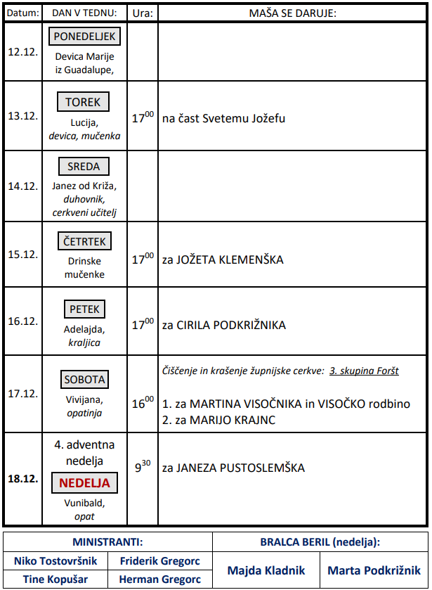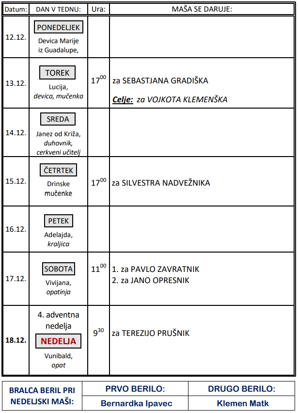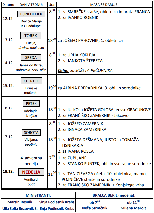 Svete maše v tednu od 12. do 18.12.