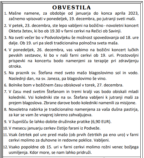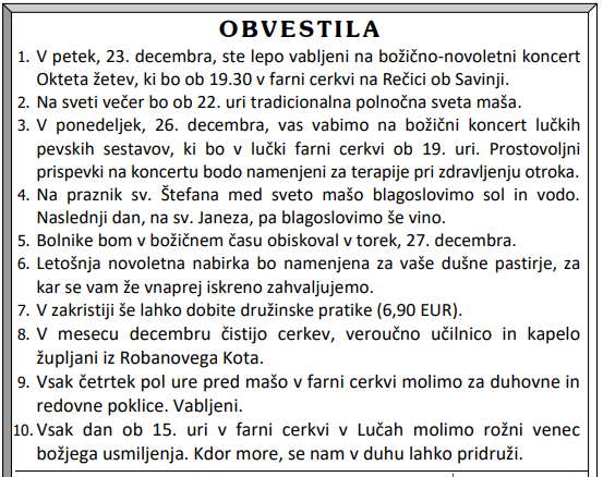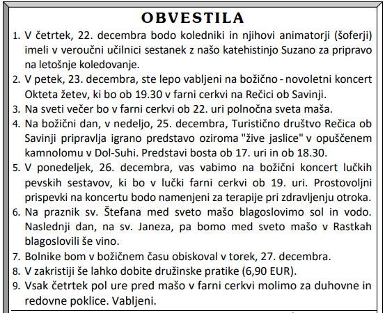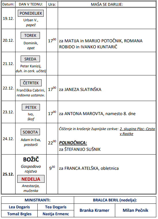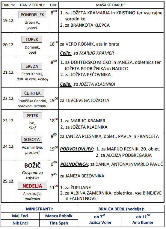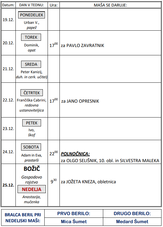 Svete maše v tednu od 19. do 25.12.