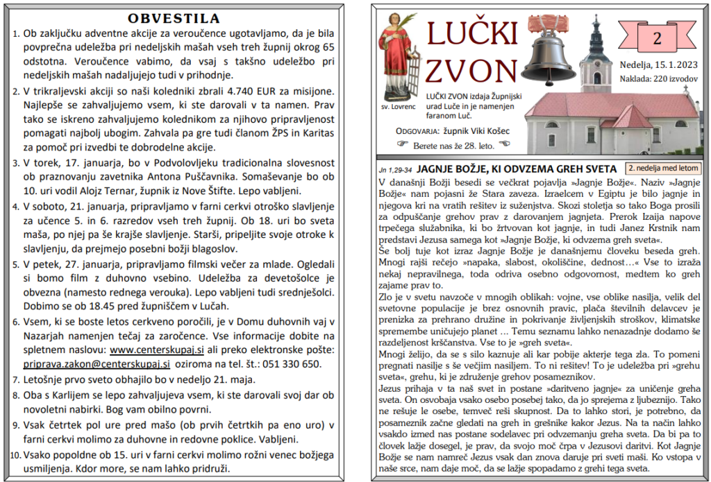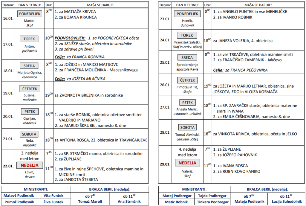 Svete maše v tednih od 16. 1. do 29. 1. Od sedaj naprej bodo oznanila na treh podstraneh. Prva podstran – Luče, druga podstran – Solčava in tretja podstran – Ljubno ob Savinji. Med stranmi se premikate s številkami, ki so na dnu prispevka. LUČE Strani: 1 2 3