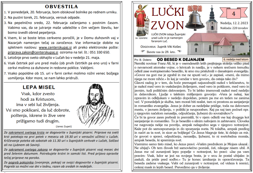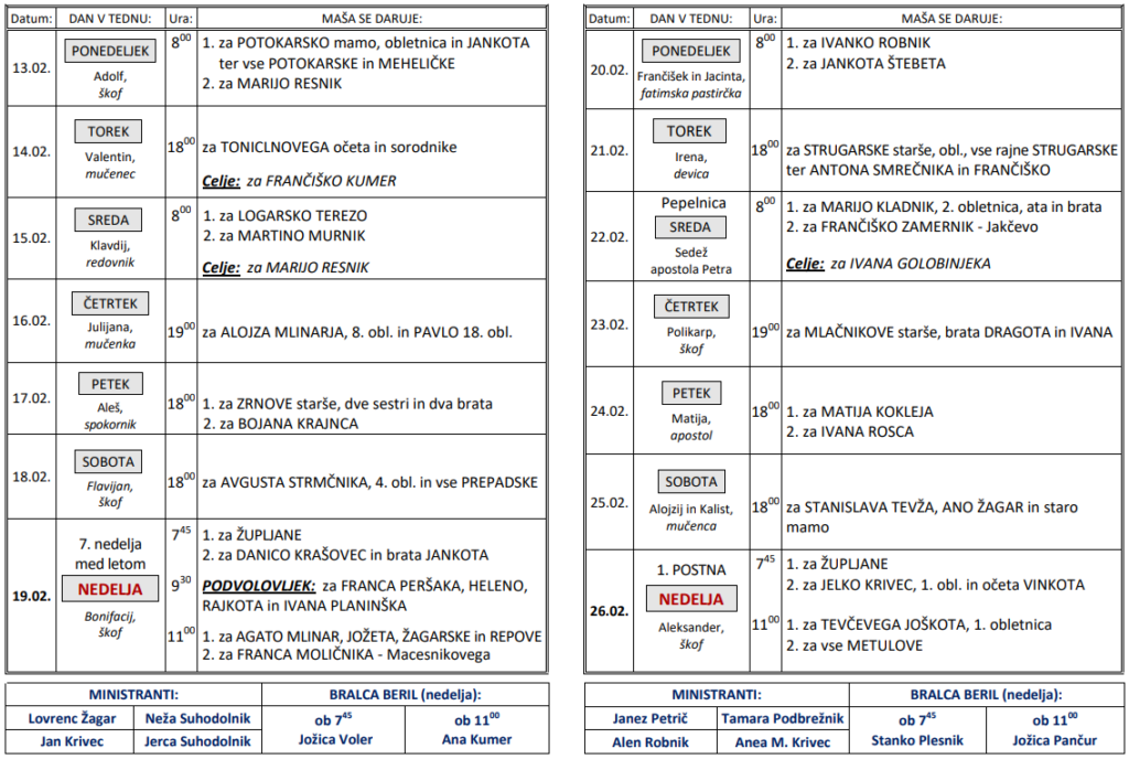 Svete maše v tednih od 13. do 26. 2. Od sedaj naprej bodo oznanila na treh podstraneh. Prva podstran – Luče, druga podstran – Solčava in tretja podstran – Ljubno ob Savinji. Med stranmi se premikate s številkami, ki so na dnu prispevka. LUČE Strani: 1 2 3
