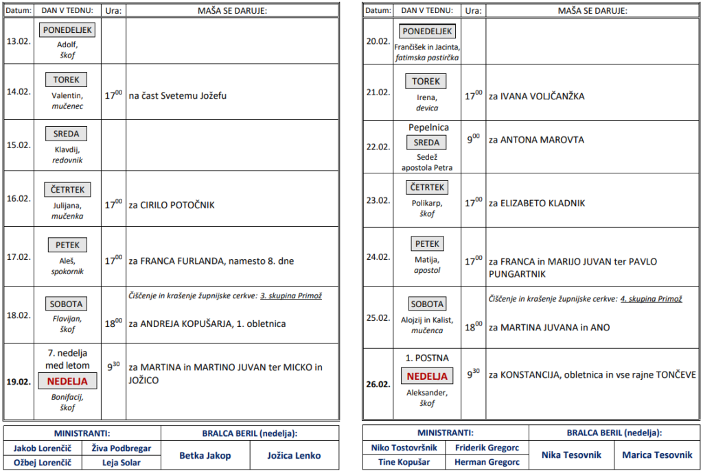 Svete maše v tednih od 13. do 26. 2.