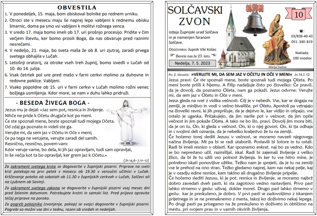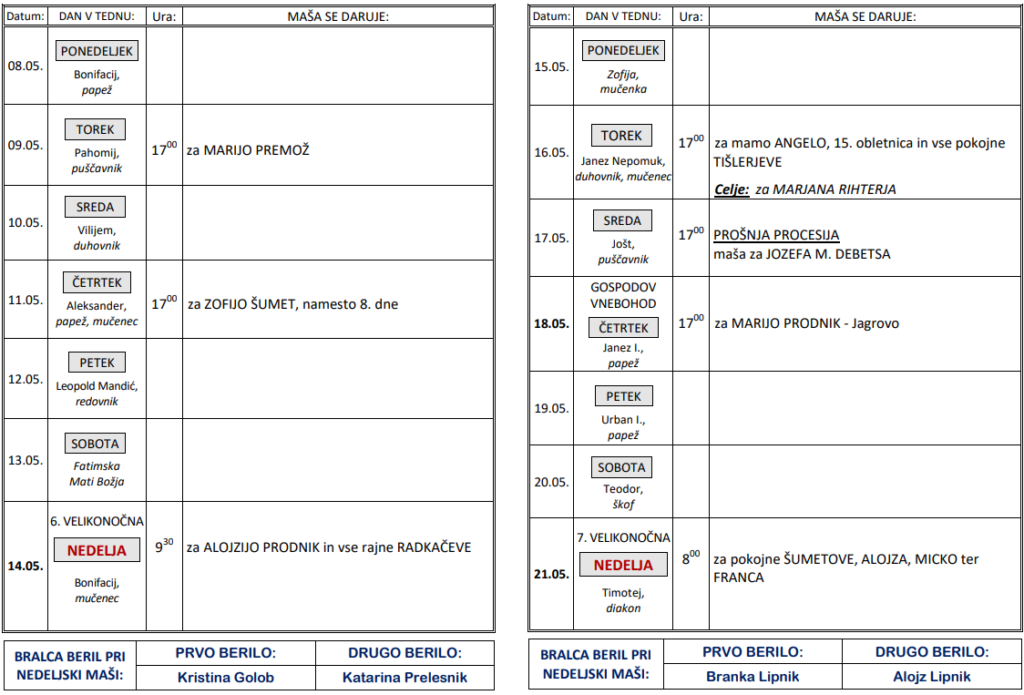 Svete maše v tednih od 8. 5. do 21. 5.