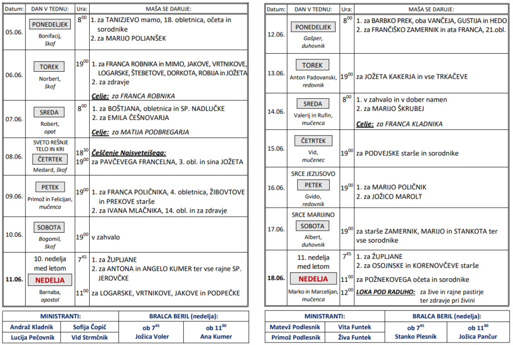 Svete maše v tednih od 5. do 18. 6.