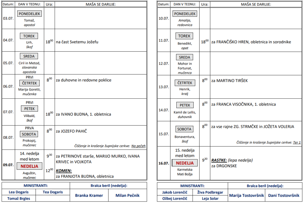 Svete maše v tednih od 3. do 16. 7.