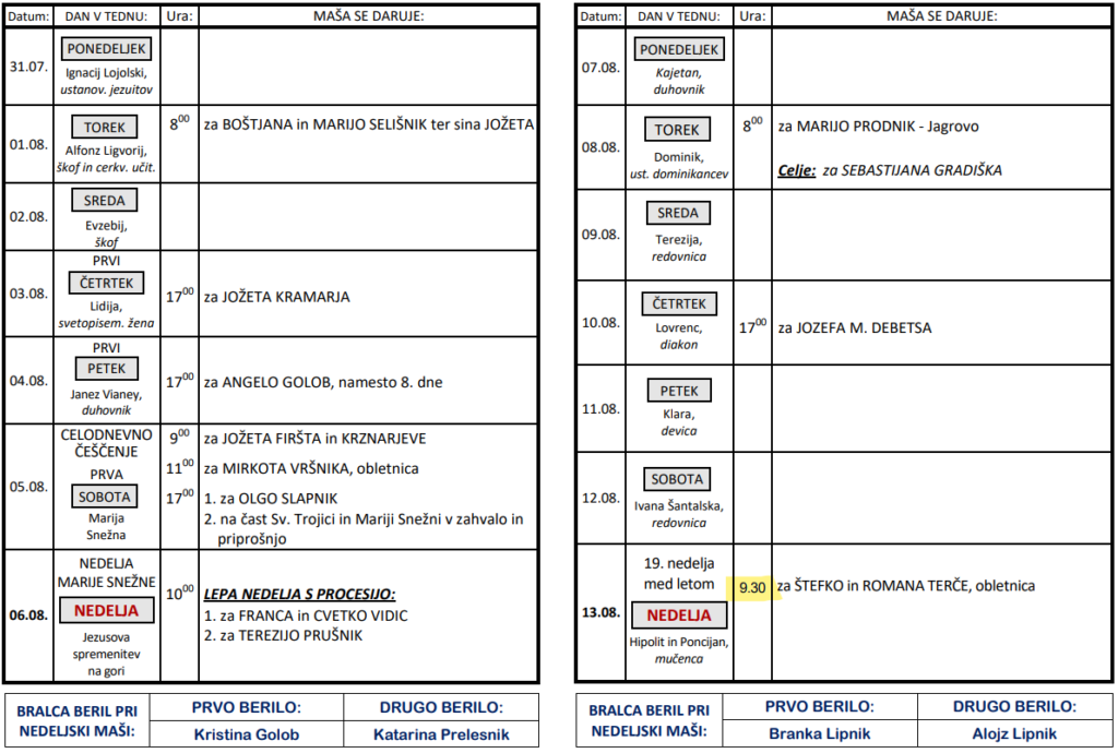 Svete maše v tednih od 31. 7. do 13. 8.