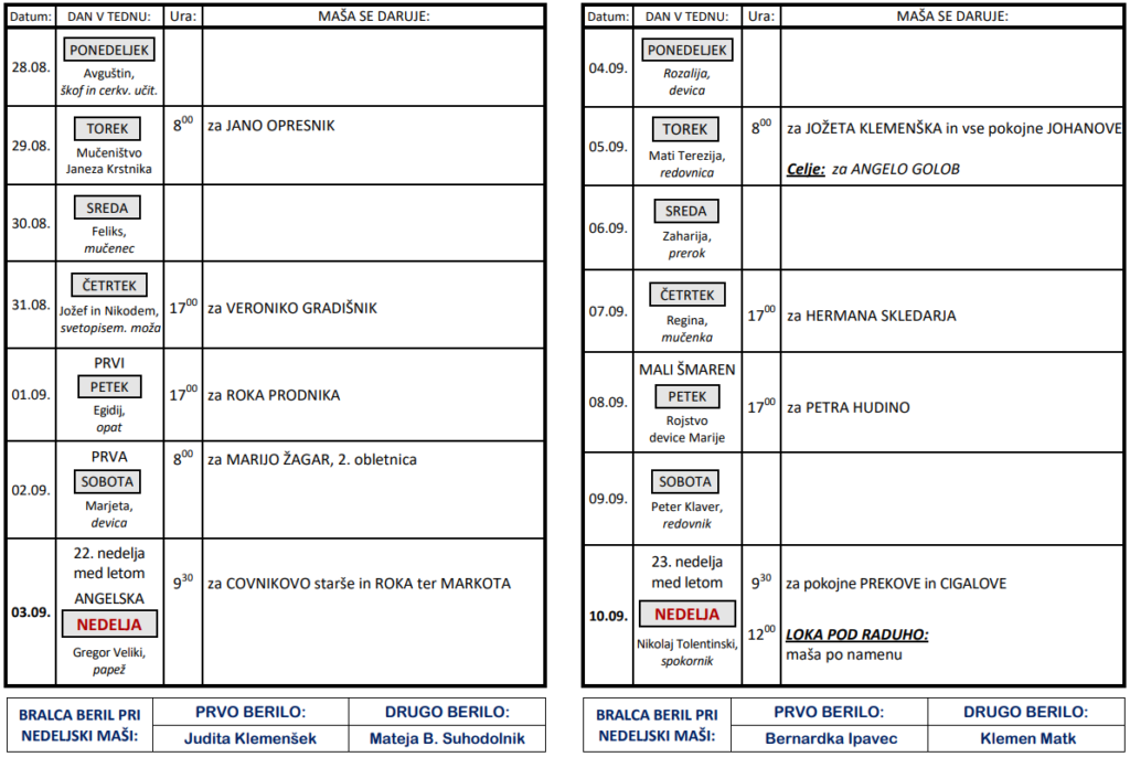 Svete maše v tednih od 28. 8. do 10. 9.