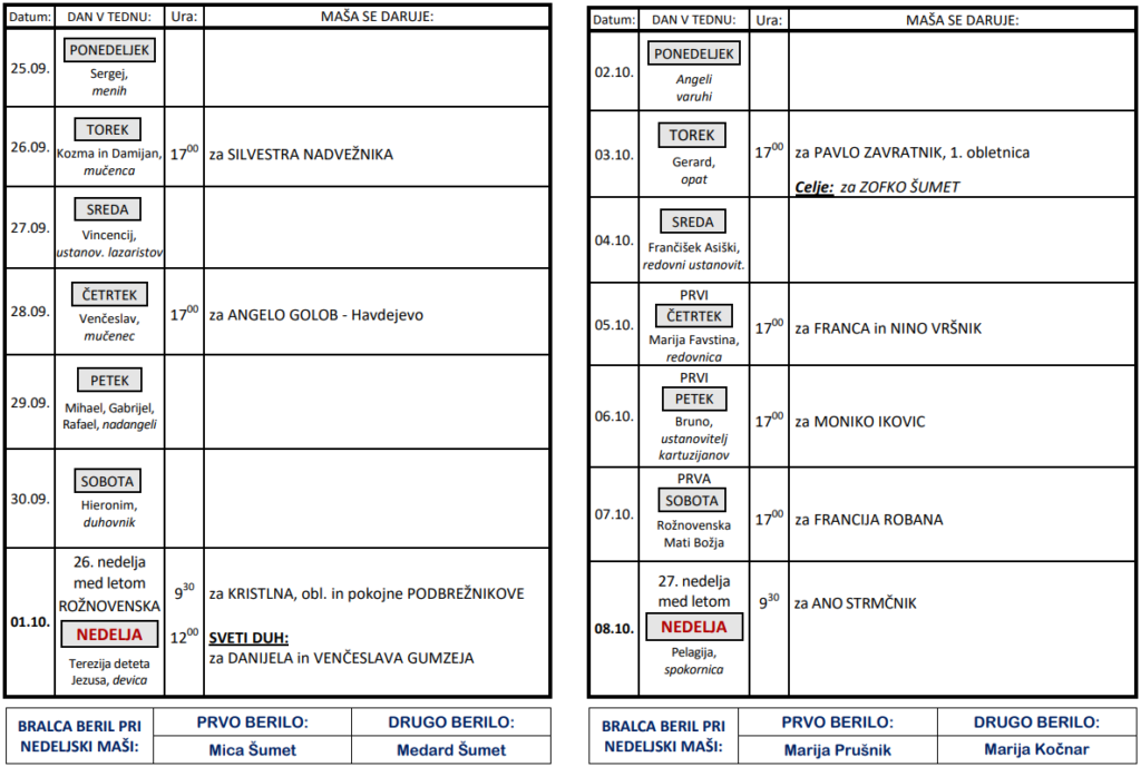 svete maše v tednih od 25. 9. do 8. 10.