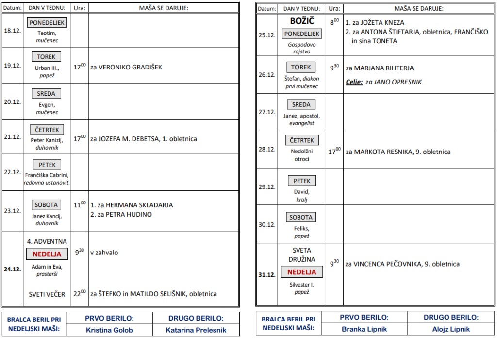 Svete maše od 18. 12. do 31. 12. 2023