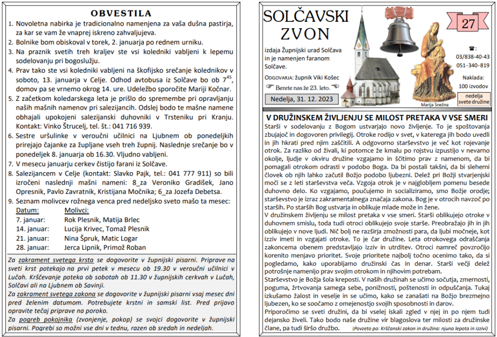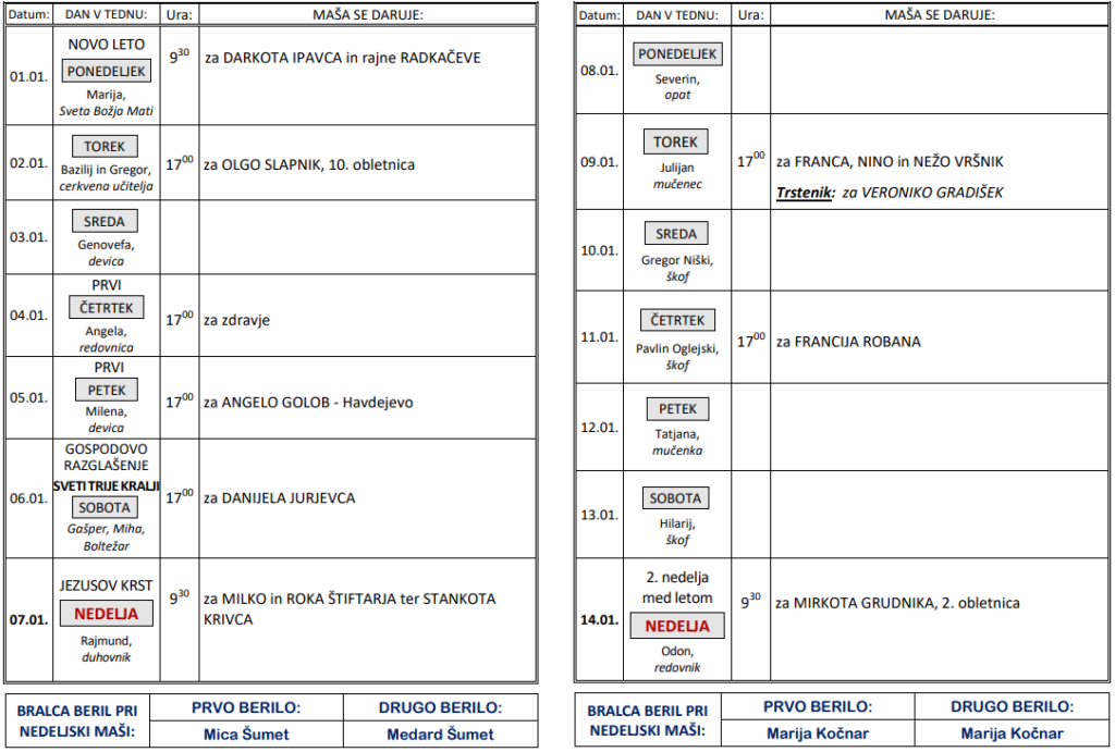 Svete maše od 1. 1. do 14. 1. 2024