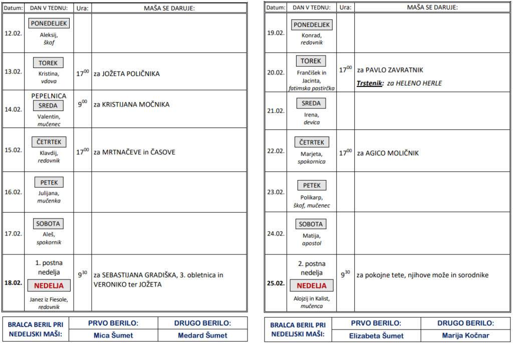 Svete maše od 12. 2. do 25. 2. 2024
