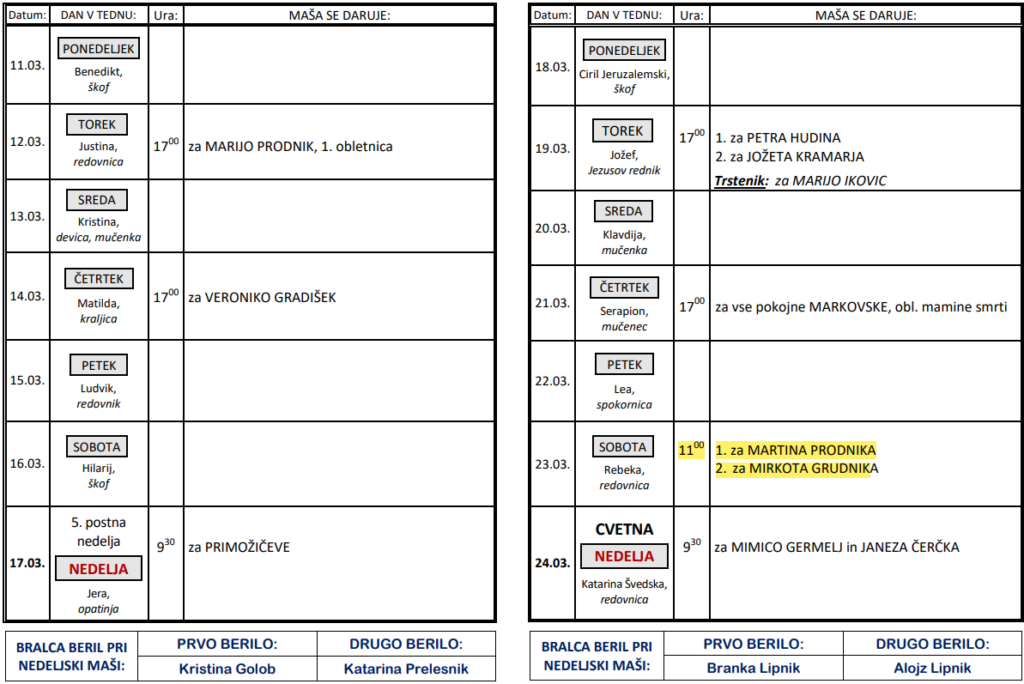 Svete maše od 11. 3. do 24. 3. 2024