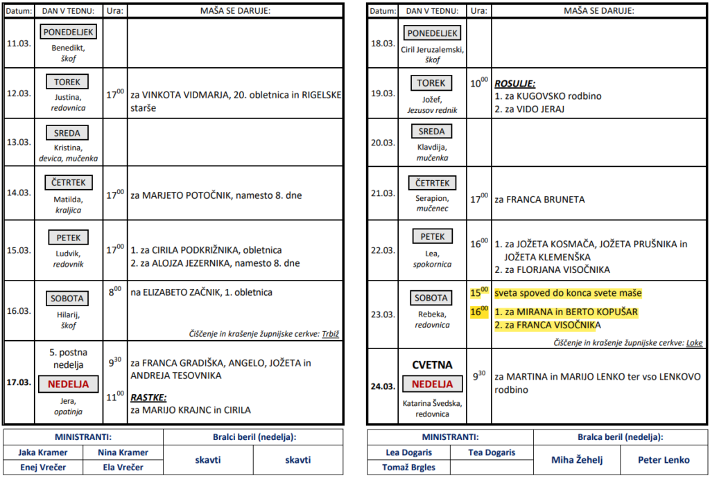 Svete maše od 11. 3. do 24. 3. 2024