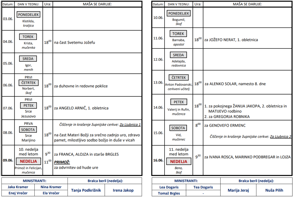 Svete maše od 3. 6. do 16. 6. 2024