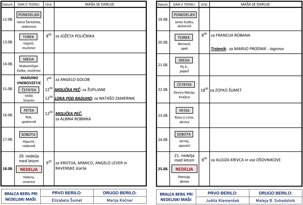 Svete maše od 12. 8. do 25. 8. 2024