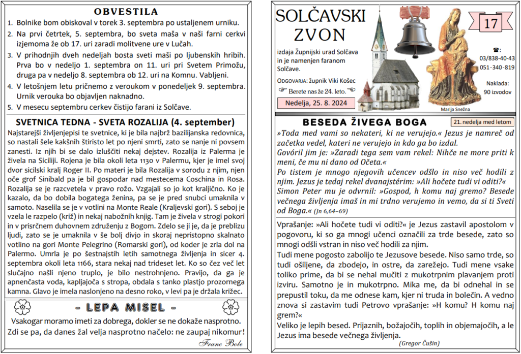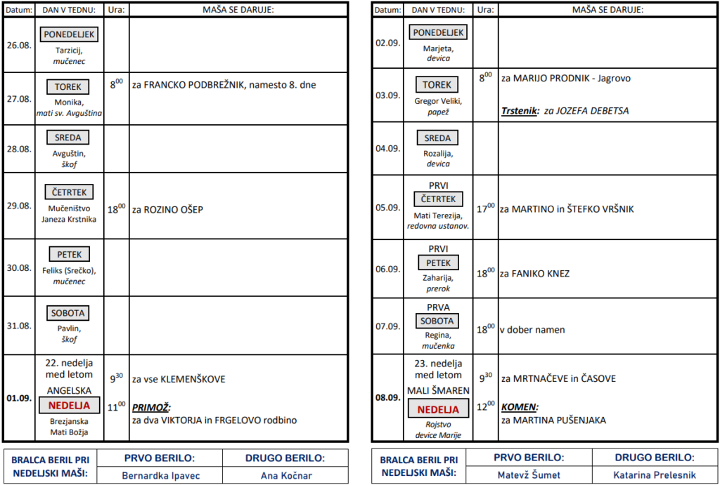 Svete maše od 26. 8. 2024 do 8. 9. 2024