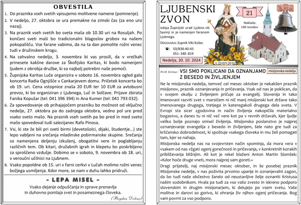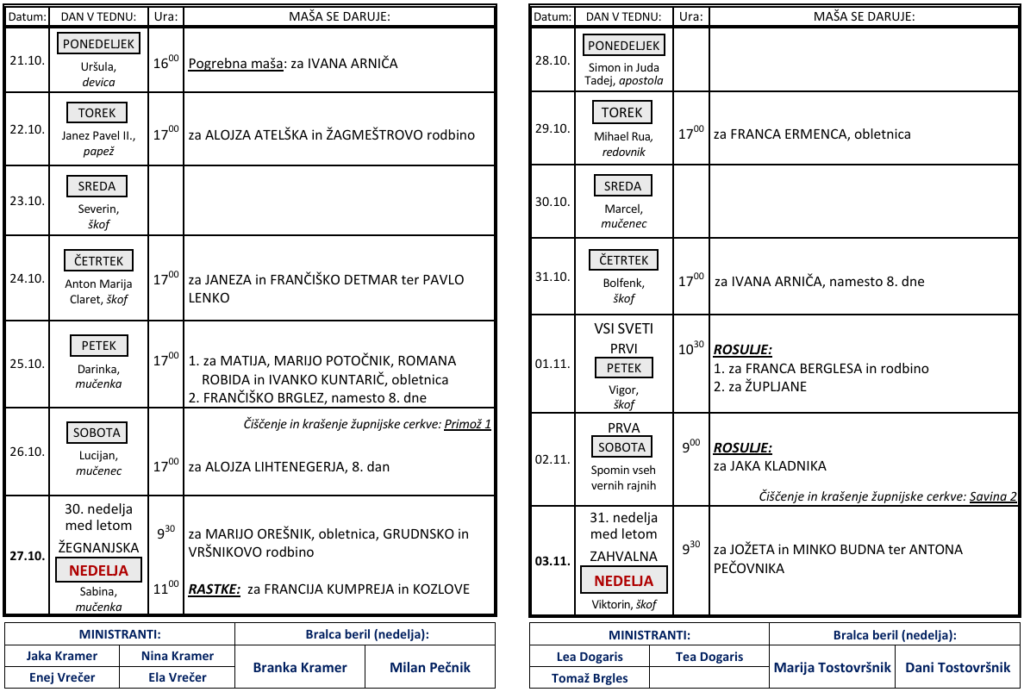 Svete maše od 21. 10. do 3. 11. 2024