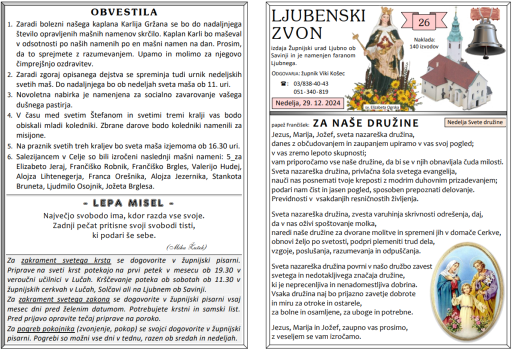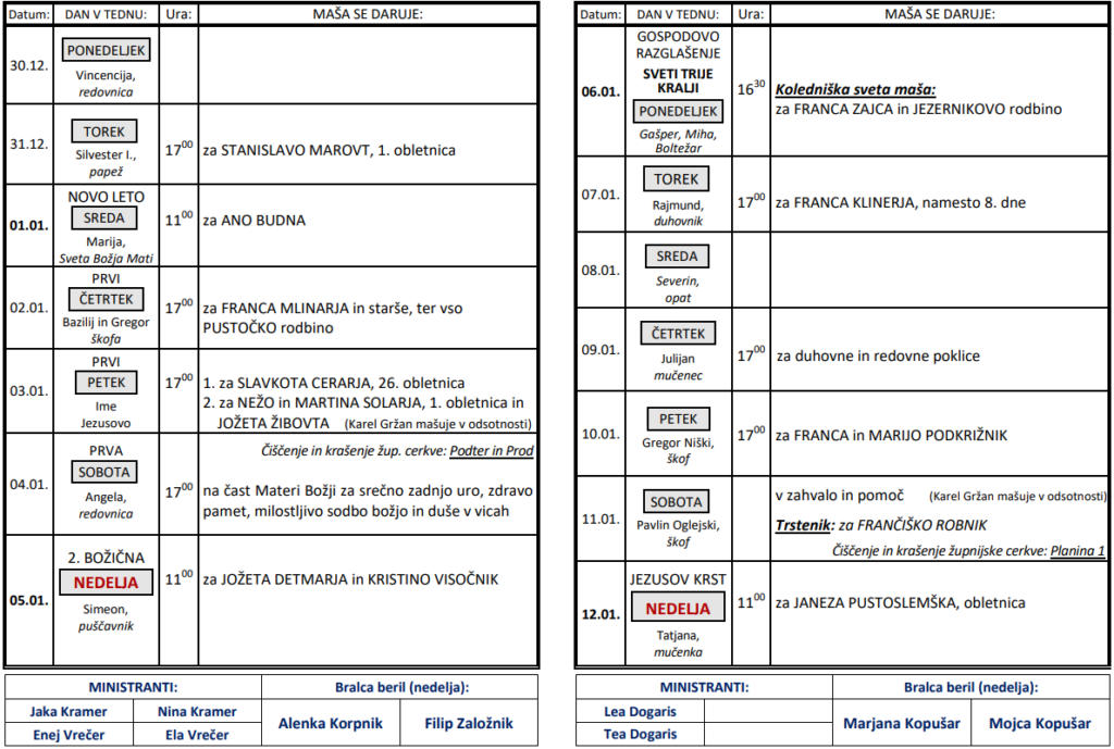 Svete maše od 30. 12. 2024 do 12. 01. 2025