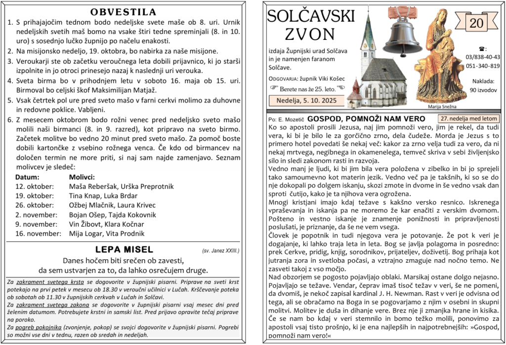 Svete maše od 6. 10. 2025 do 19. 10. 2025