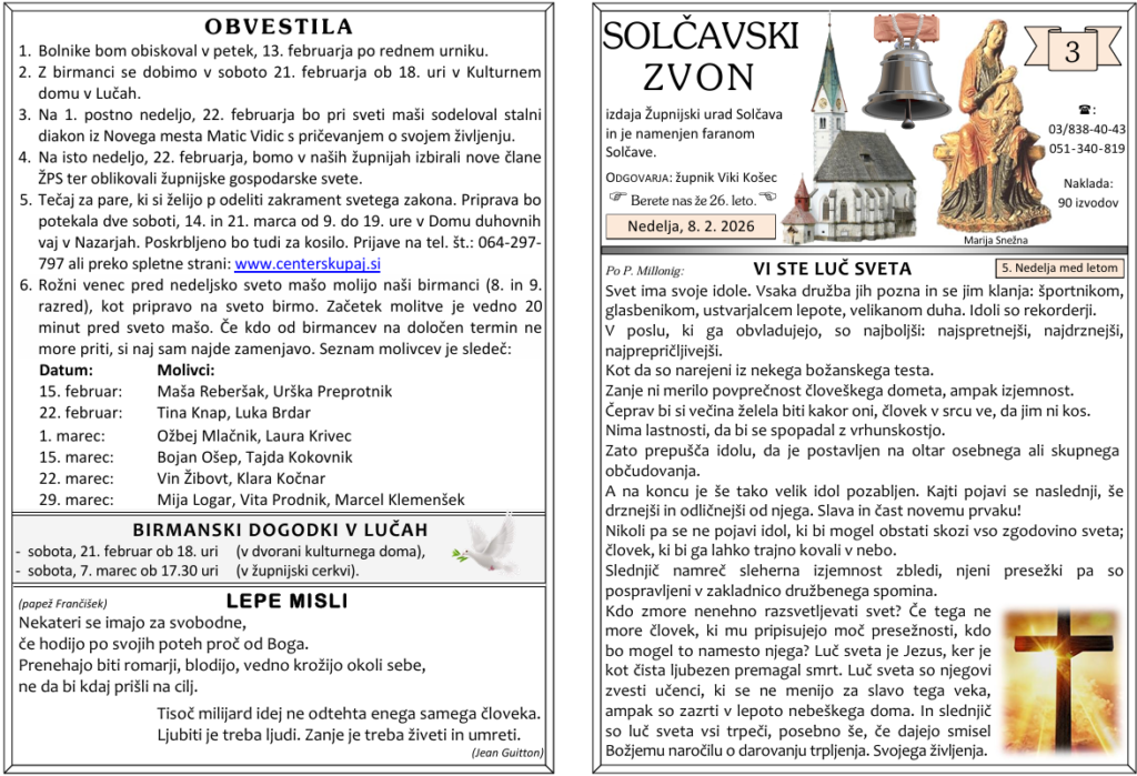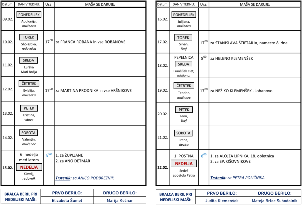 Svete maše od 9. 2. do 22. 2. 2026